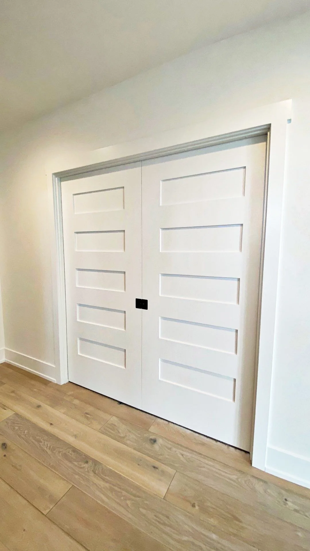• White double sliding closet doors with horizontal panels in a room with light wood flooring and white walls.