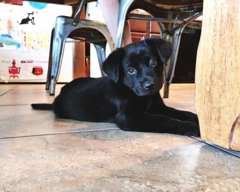 A small black puppy with floppy ears lying on a tiled floor, looking at the camera under a kitchen table.