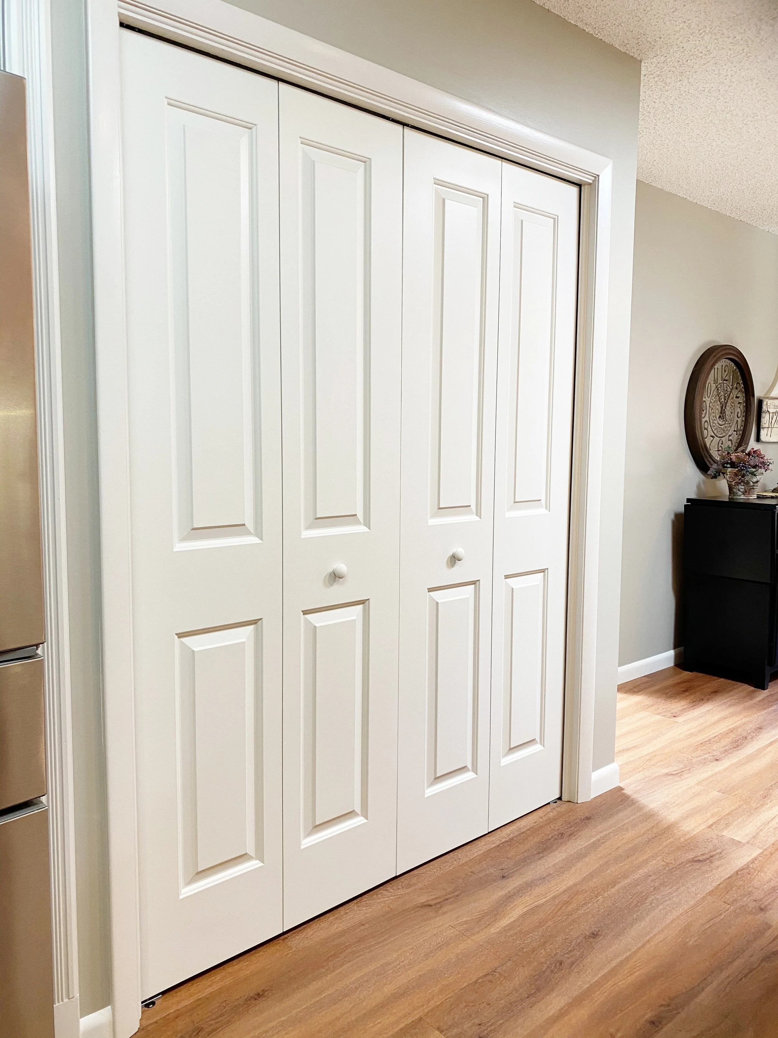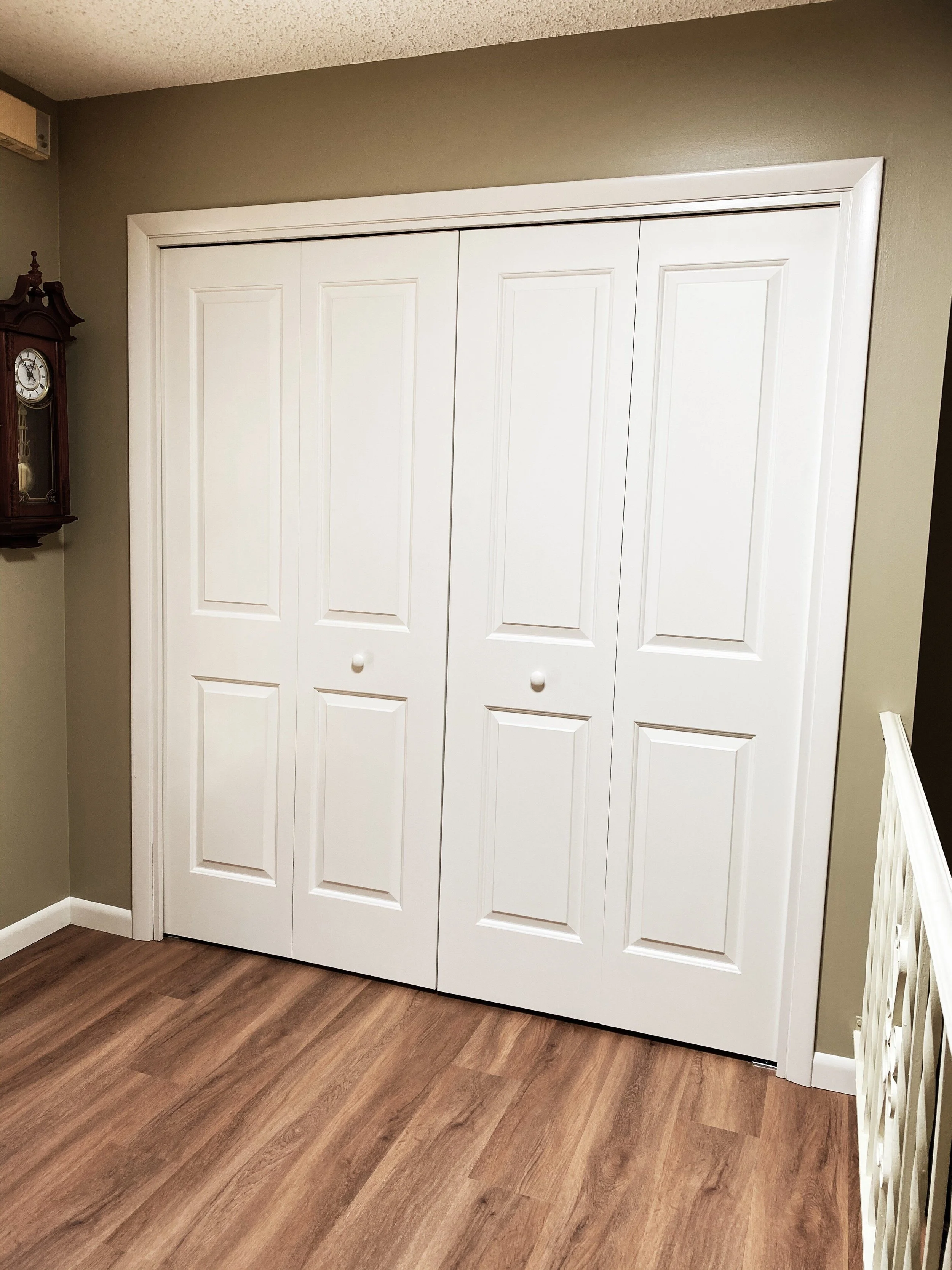 We installed new bifold doors sized to fit the existing openings, ensuring smooth movement and a tidy, symmetrical appearance. Once in place, the new doors added structure, improved access to the closets, and brought a crisp, updated look to the home.
